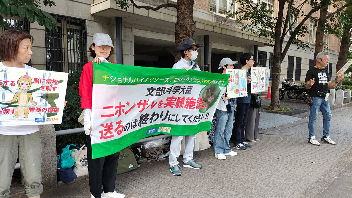 On the same day, the members of JAVA and PEACE stood in front of the MEXT building holding a banner and placards, chanting, “Abolish the National BioResource Project ‘Japanese Macaques’ ” and “No to animal testing!”